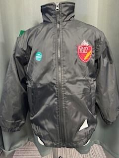 Reversible waterproof jacket with fleece lining and embroidered school logo.